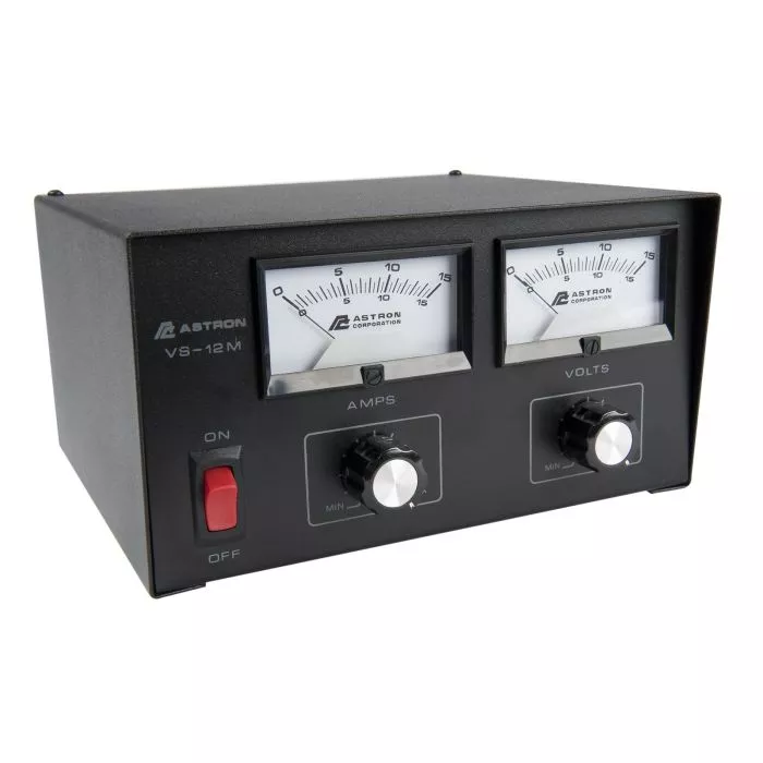 The Astron VS12M is a linear, regulated desktop power supply designed for powering 12 Volt electronic products, particularly popular for ham and CB radios. It provides an adjustable output voltage from 2 to 15 VDC and features dual meters for monitoring voltage and current.