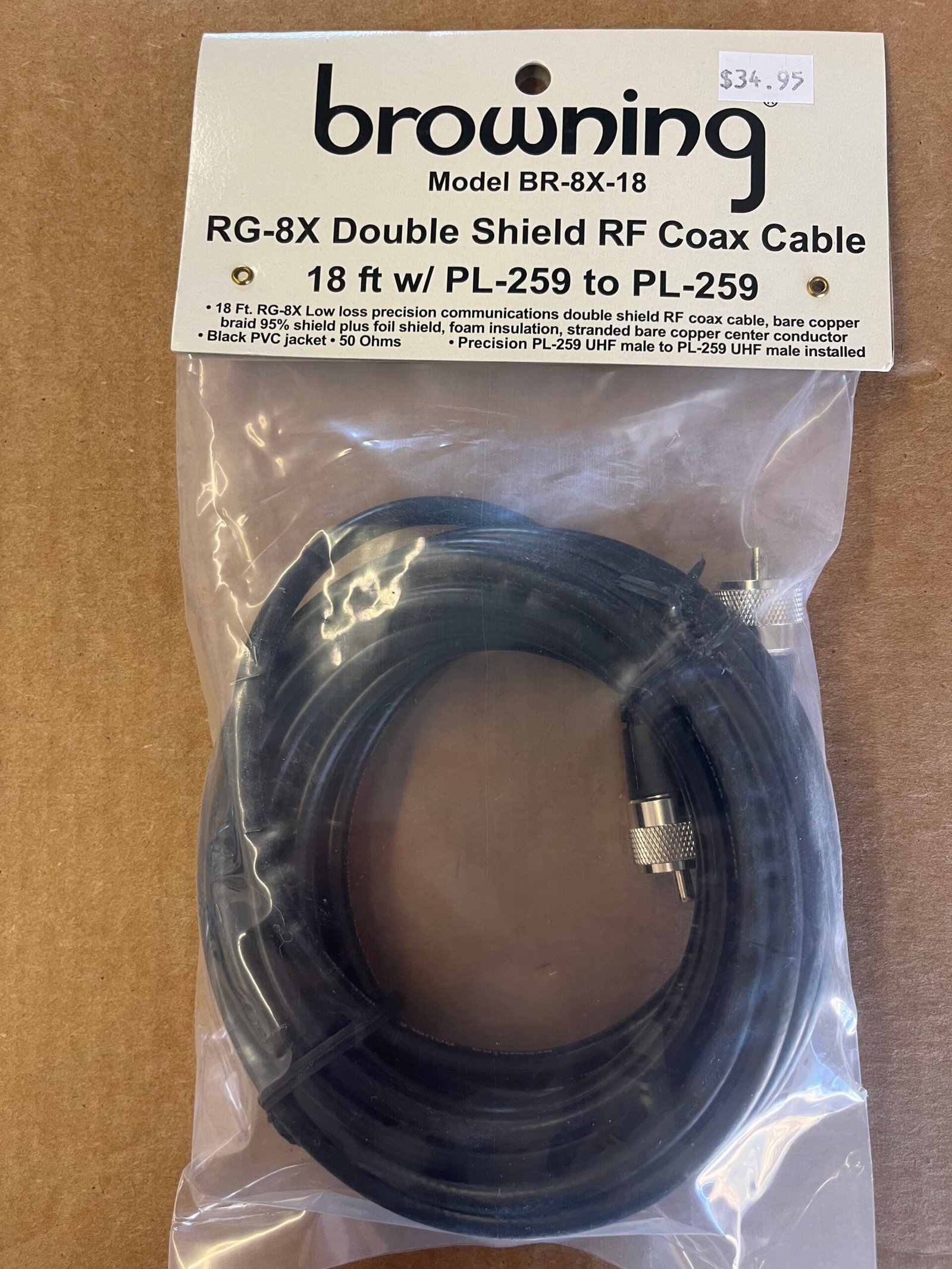 The Browning BR-8X-18DS is a model number for an 18-foot, low-loss, double-shielded RG-8X coaxial cable assembly used for CB and amateur radios. It comes with pre-installed UHF male PL-259 connectors on both ends.