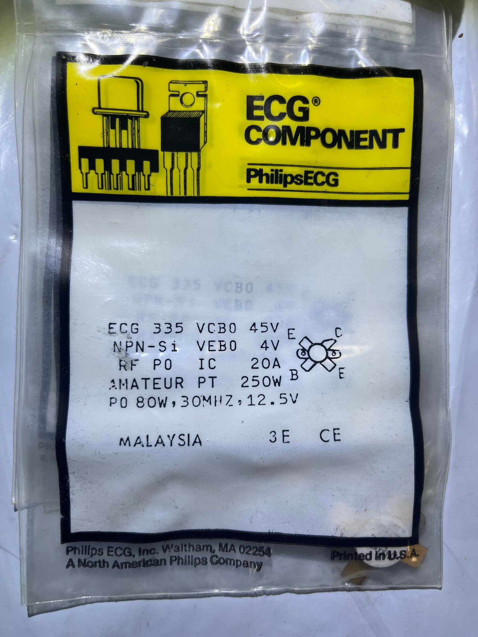 The ECG335 is an NPN silicon RF power transistor designed for amplifier applications in industrial, commercial, and amateur radio equipment operating up to 30 MHz. Its equivalent is the NTE335.