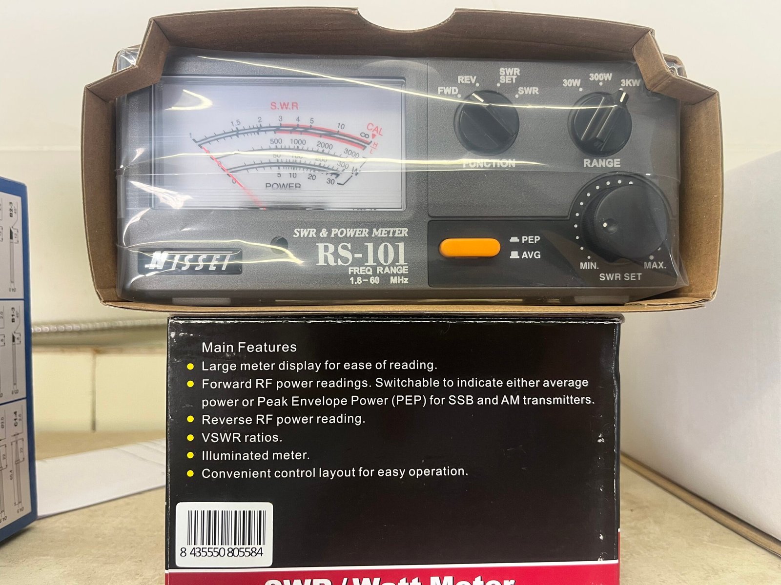 The Nissei RS-101 is a robust SWR and power meter designed for HF frequencies with a range of 1.6-60 MHz, widely used by amateur radio and CB enthusiasts. It measures forward power, reflected power, and VSWR, and features a large, illuminated analog display for easy reading.