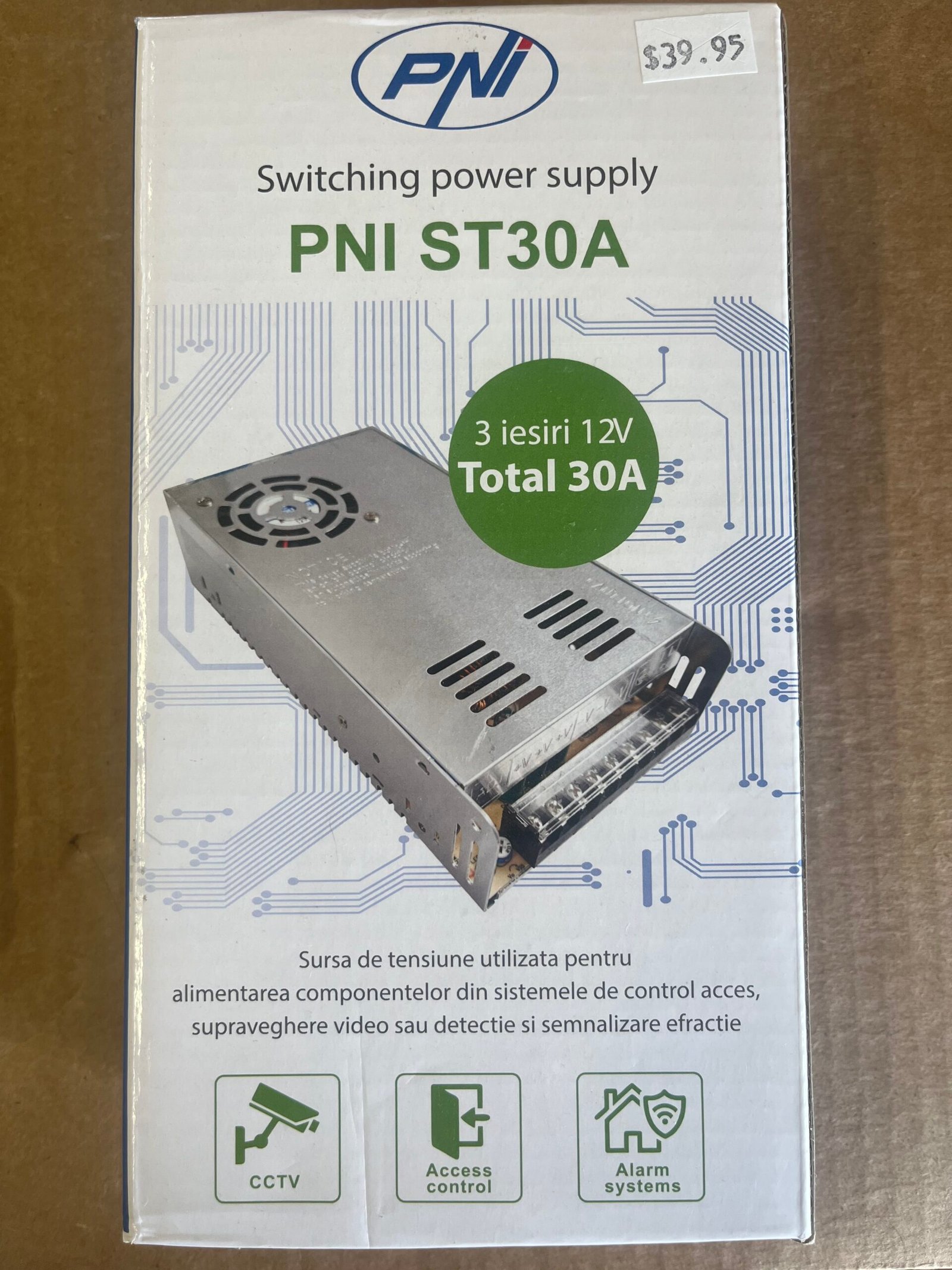 The PNI ST-30A power supply is a switching voltage source that provides a stable 12V DC output with a maximum current of 30A (360W), designed for various electronic applications.