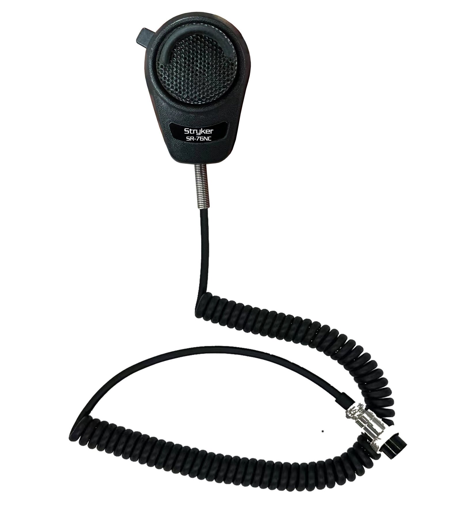 The Stryker SR-76NC is a rugged, noise-canceling electret microphone designed for use with most 4-pin CB and 10-meter radios, providing clear audio in noisy environments. It features internal tone and gain adjustments and requires a single AAA battery for operation.
